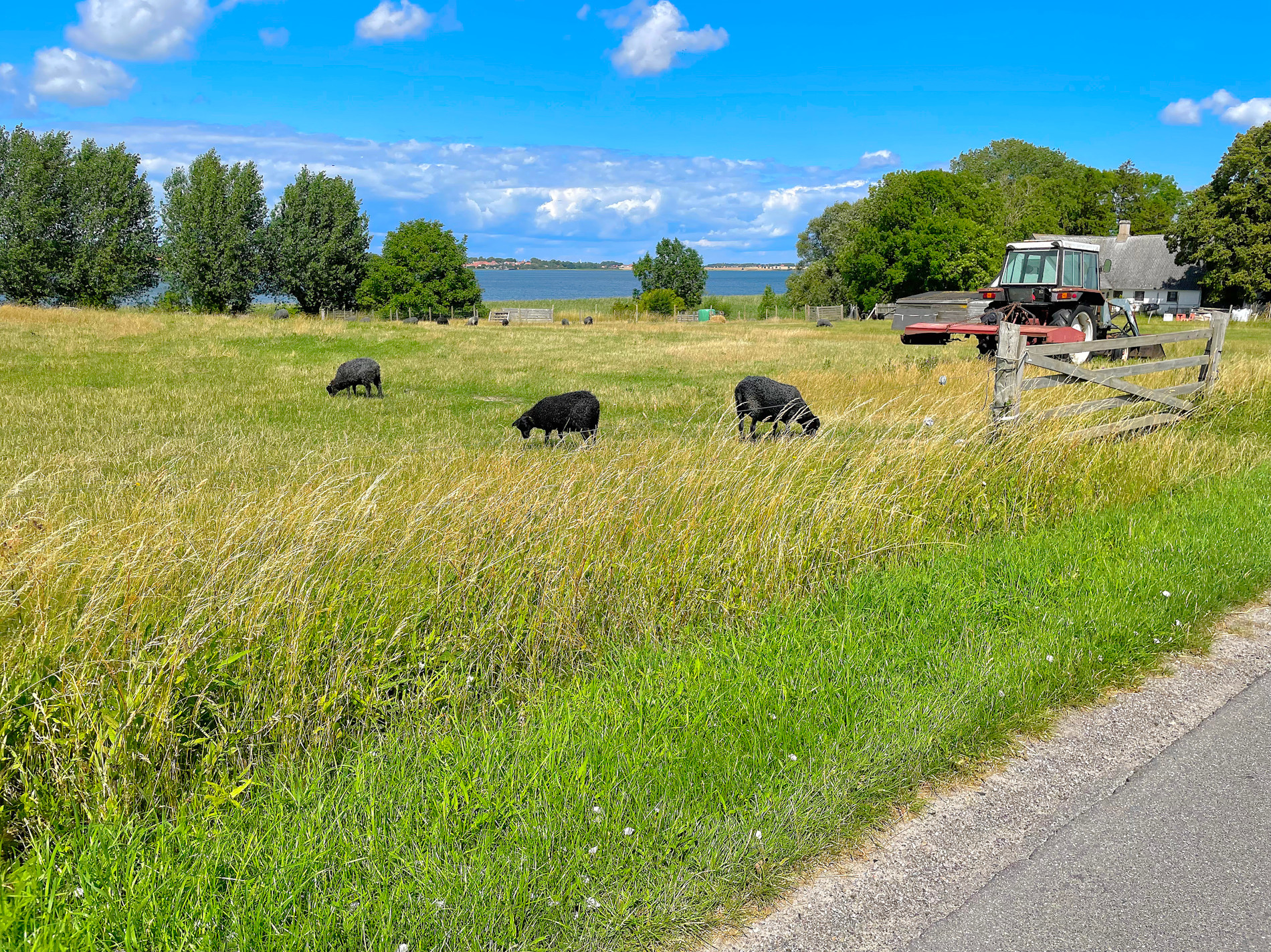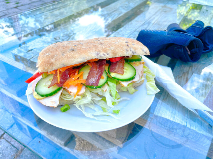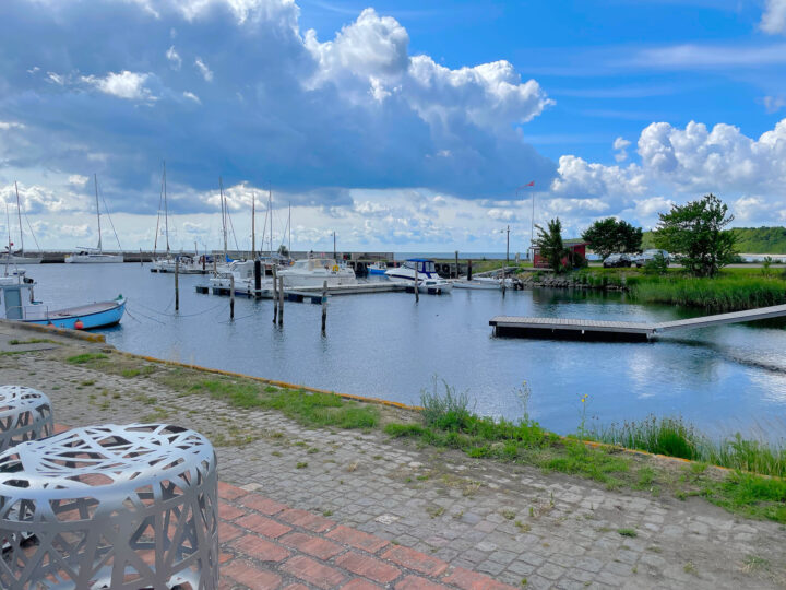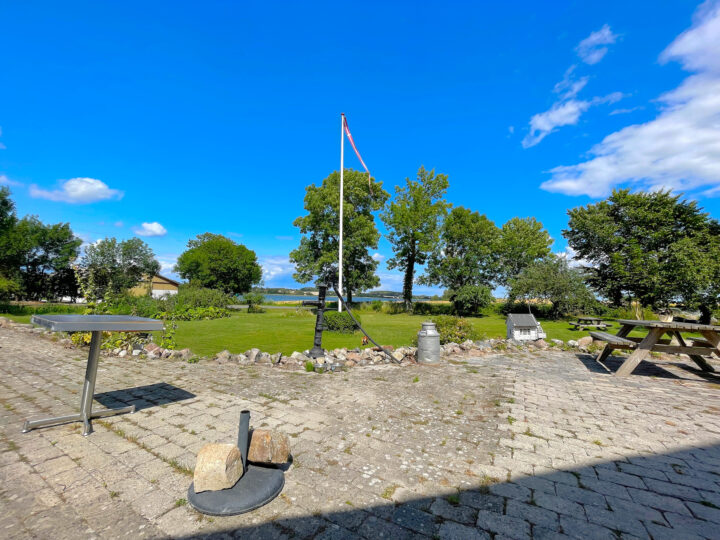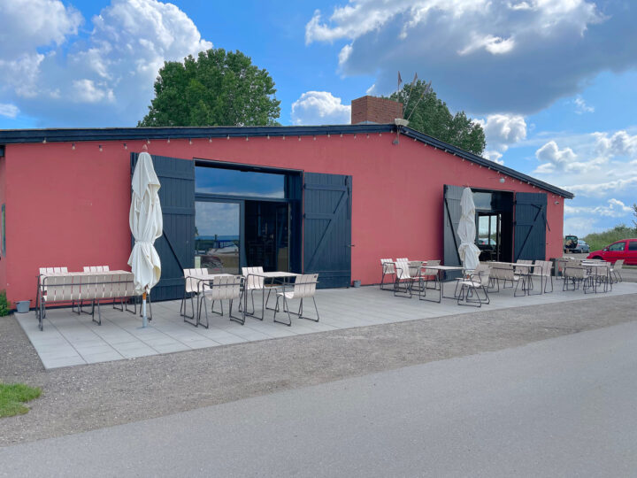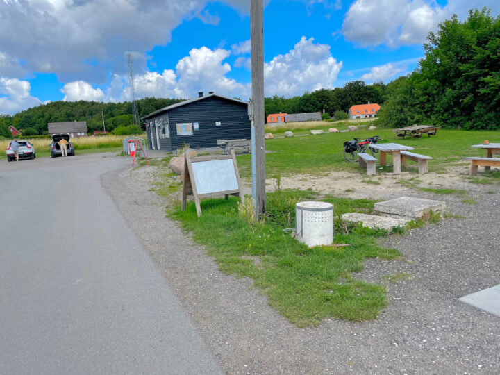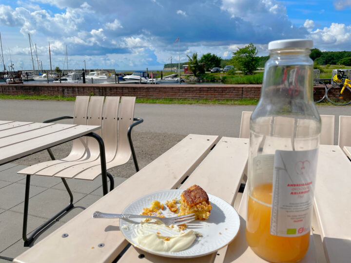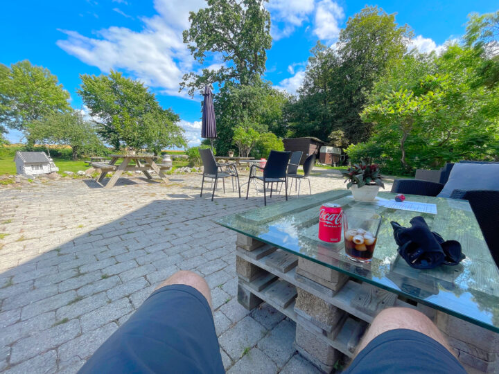 I passed Hårbølle Harbor and continued northeast on small asphalt roads with fields on both sides, briefly interrupted by tiny towns that all exuded Denmark at its best. I stopped at a little café/B&B right by the roadside. I think I had just under 10 km left before reaching the summer house. The weather was gorgeous, I had plenty of time, and even my ankle had recovered over the last few days. I deserved a break and a little treat: I ordered a cola with ice cubes and a delicious chicken sandwich—and I enjoyed them both at a leisurely pace.