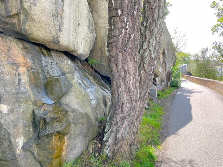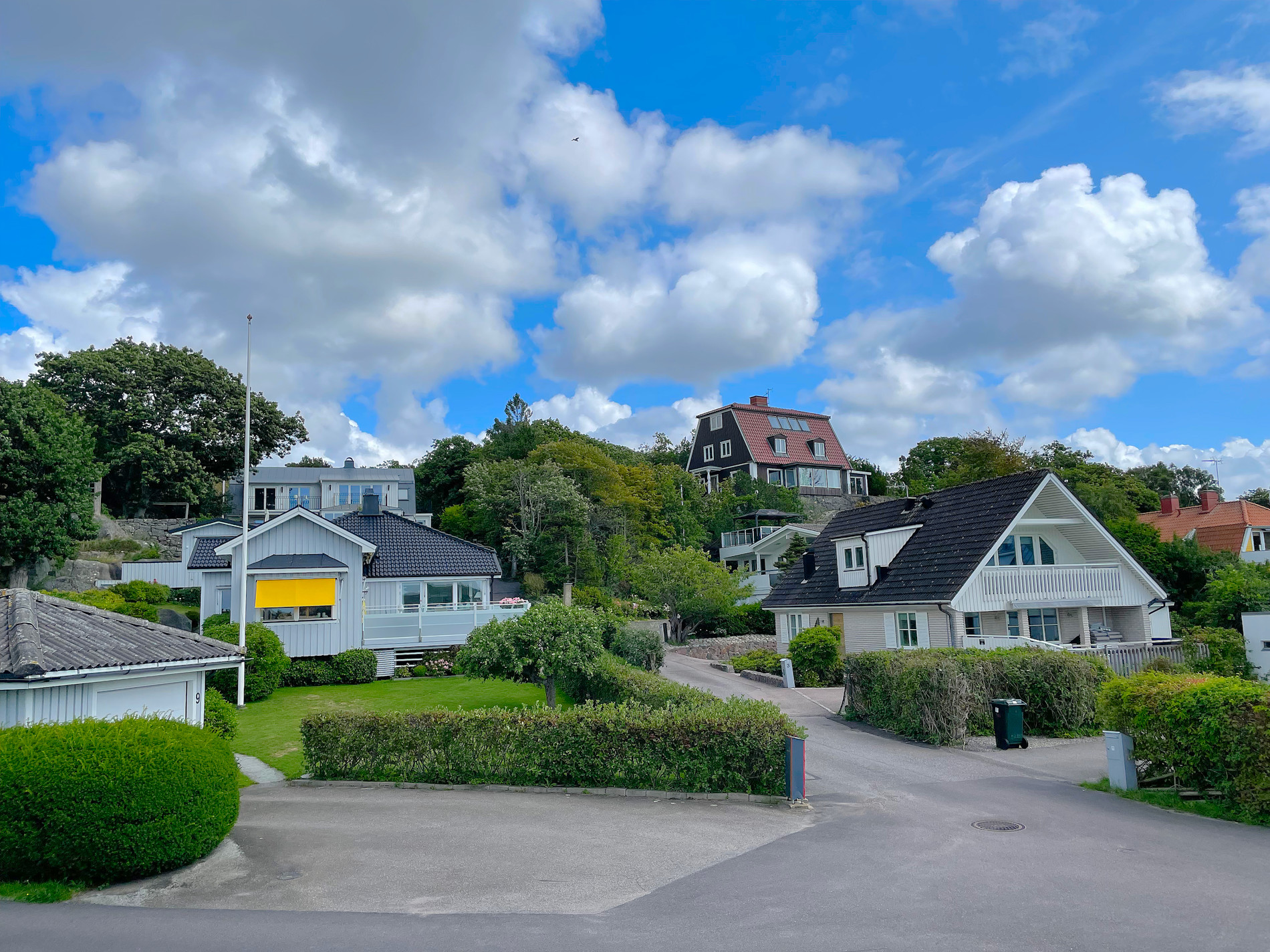I’m starting to see more rocky cliffs now, even when I’m not right by the coast. The route often takes me down to a small harbor town and its surrounding summer houses, then back inland to the fields — back and forth like that.