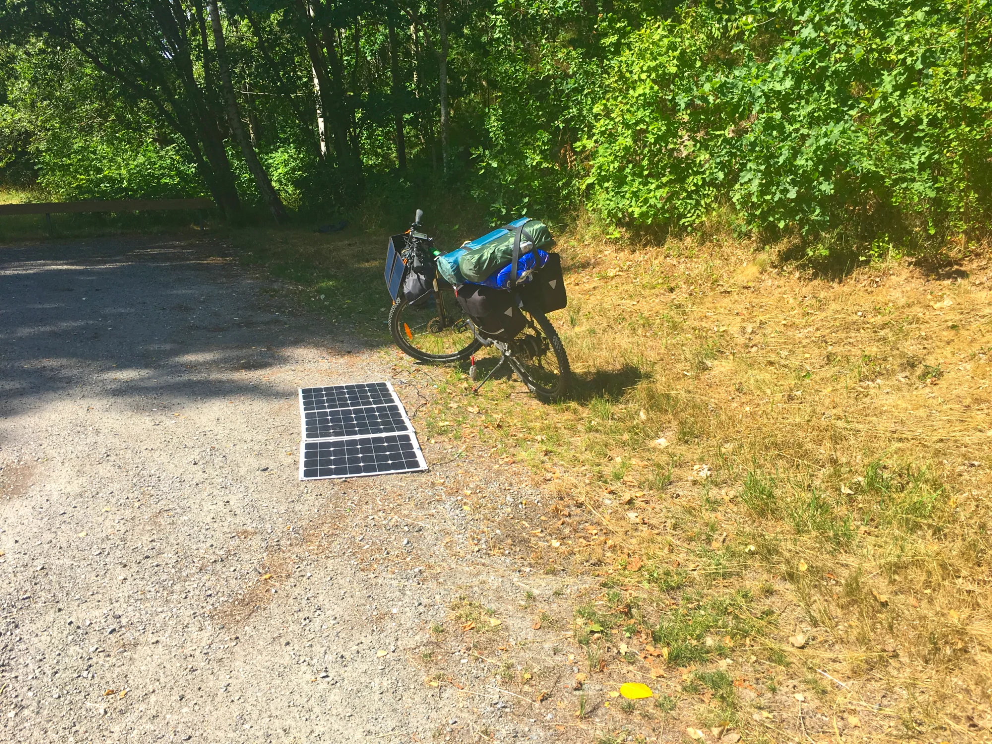 I rode my bike for about 45 km until about 12.00 am. At this time I stopped for a long break to top up the battery on my bike. So I dismounted the solar panels and passed the time with reading some in my book and eating some quite sour apples from a tree.